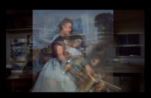 Dans ces deux fragments – comme dans toute la série – Laurent Fievet déploie tout un jeu autour des cadres et des recadrages. Dans Fenêtre sur cour, Jeff observe lui-même depuis le cadre de sa fenêtre, qui donne à voir une série d’autres cadres constituée par les fenêtres et portes de son voisinage. Dans States of Grace, les cadres des tableaux sont matérialisés, donnés à voir et se délimitent de manière très nette avec les images du film. Or, à d’autres moments et en particulier dans State of Grace VI, La Vierge au rocher est agrandie, son cadre placé dans le hors-champ pour que le visage de Jeff se calque sur celui de Jean-Baptiste. Plus que les corps, ce sont les décors qui se fondent entre eux. Par l’apparition des tableaux, l’espace du film est amené à se transformer et les personnages basculent de l’appartement à la caverne de La vierge au rocher. L’assiette en gros plan que vient de servir Lisa devient alors à portée de main de l’enfant Jésus, de Jean et de Jeff. Dans State of Grace V, lorsque Lisa raccompagne le majordome vers la sortie, elle referme la porte dont le cadre vient aspirer le tableau qui s’y dissipe. Les deux cadres ne se confondant pas tout à fait, l’un appelle toutefois l’autre à se fondre en lui. Les effets produits sont alors le résultat d’une composition qui naît de la décomposition du mouvement. Les images du film d’Hitchcock sont ralenties, proche du stop motion, une décomposition presque organique qui laisserait échapper une autre matière, une substance produite par le mouvement du film que la peinture, numérisée, aurait perdue et dont elle se saisit pour se mouvoir. Laurent Fiévet rompant avec le défilement des vingt-quatre images par seconde crée un autre effet du mouvement cinématographique : une image flotte à la surface d’une autre. Le mouvement devient flou, s’estompe. En effet, au début de State of Grace V Lisa et le majordome donnent le sentiment de flotter alors qu’ils traversent la pièce.