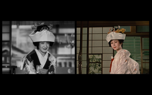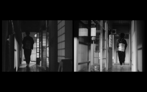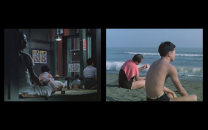 Si le kintsugi consiste à recoller les céramiques brisées avec de l’or, ici, cette collure se crée justement par l’installation en diptyque, recollant deux plans tout en laissant visible leur séparation. Si, dans la première proposition, cette construction permet de souligner davantage les symétries déjà existantes entre les personnages et leurs mouvements au cœur d’un même plan, il s’agit, dans la seconde, de créer des symétries entre différents films et donc des effets de circulations entre les plans, semblant alors s’entrecroiser, se mélanger, s’imiter. Il n’est plus seulement question de coller les fragments d’un même objet afin d’en donner une vision nouvelle, mais de rapiécer plus largement cette sélection de l’œuvre du réalisateur par ses points concordants : parfois par un son, un infime détail qui se répercute dans le plan d’à côté, et crée une résonance, une communication avec lui. Les mouvements des personnages se répètent et s’imitent tant qu’ils en deviennent quasiment des chorégraphies, les dialogues semblent fluides alors qu’une séparation visible existe entre les deux plans, et les lieux reviennent, parfois légèrement changés, parfois quasiment identiques, comme s’ils n’avaient jamais été quittés.