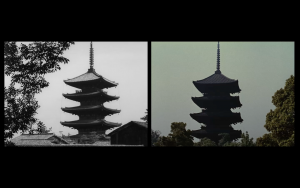 Plutôt que celui des « mots de saisons », Laurent Fiévet propose de découvrir son propre répertoire de motifs ozuiens. Déjà, cette sélection de films et la vision de l’artiste développés dans le montage, mettent en évidence le rapprochement du travail du réalisateur avec le genre poétique du haiku, et dévoilent ce que l’on pourrait considérer comme un saijiki propre à son œuvre. Puis le montage composé par Laurent Fiévet poursuit plus précisément cette analogie, mettant en lumière davantage de parallèles entre les films d’Ozu et d’autres arts japonais. La série Saijiki se décline ainsi en trois installations, chacune nommée à partir d’un mot désignant d’autres traditions esthétiques nippones : Kigo met en avant les plans vides de présences humaines et renforce un peu plus le rapprochement avec le haiku de la série tout entière ; Wagara prend la forme d’un diptyque de plans, et souligne la présence récurrente des motifs japonais que son titre désigne ; et finalement, Kintsugi, qui se décline en deux propositions également construites en diptyque, recollent des symétries qui s’installent, d’une part, dans et entre les plans d’un même film, et d’autre part, entre ceux de films différents.
