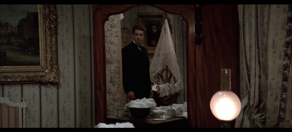 Le montage insiste sur les efforts faits pour placer convenablement la subtile voilette qui fait alterner un visage puis l’autre tandis qu’elle plisse, altère les traits o soudain se détend, glisse, avant de revenir masquer les sentiments de l’épouse tout en répandant imaginairement les effluves du nouveau parfum. Tullio est troublé, étant tantôt celui qui opère et tantôt celui qui subit la métamorphose, révélant de la sorte son rôle dans l’attitude de Giuliana. De son côté, la jeune femme est soucieuse des transformations éventuellement apportées par sa nouvelle vie en se regardant dans le miroir. Chez Visconti, avant de sortir, son reflet est doublé d’un tableau de femme mûre visible dans la profondeur de la pièce, à son retour c’est l’image d’une jeune fille en robe claire qui côtoie son portrait anxieusement scruté. Laurent Fiévet choisit ce second temps où l’épouse ne sait si s’affiche son apparence habituelle ou son intime bouleversement.