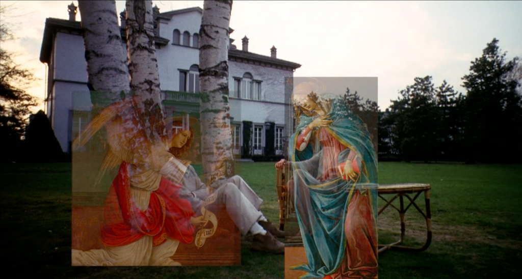 Lucia et son visiteur font leur cène : il s’apprête à quitter la mère de famille, livrée à elle-même et à son chamboulement. Ce dernier face-à-face est pourtant indémêlable d’un à venir, Laurent Fiévet transformant la scène en une Annonciation (faite à Lucia), alors même que le visiteur reste muet, laissant la parole (inaudible dans la pièce) à son vis-à-vis. Une accumulation d’Annonciations renaissantes se superpose au plan du Théorème de Pasolini, comme pour mieux démentir ou exorciser cet adieu. La liquidation d’une brève rencontre se transforme en promesse, par la grâce d’une composition décalquant l’iconographie classique de l’Annonciation – l’Ange Gabriel, les ailes faites des troncs d’arbres dans le dos, face à la Vierge Marie, le livre abandonné à ses côtés, dans l’hortus conclusus, « jardin enclos » qui la symbolise. Raccrocher le moment où s’ouvre un abîme à une imagerie reconnue, c’est combler un « vide », celui que laisse le départ du visiteur dans la vie de Lucia. A cette compensation visuelle s’ajoute une consolation auditive, le monologue de Lucia étant remplacé par le son d’une scène ultérieure (portière qui claque, moteur de voiture, râle, Requiem de Mozart), quand Lucia s’est offerte à un homme de passage. Loin de la naissance de l’enfant de Dieu, donc, promis par cette prolifération d’Annonciations.