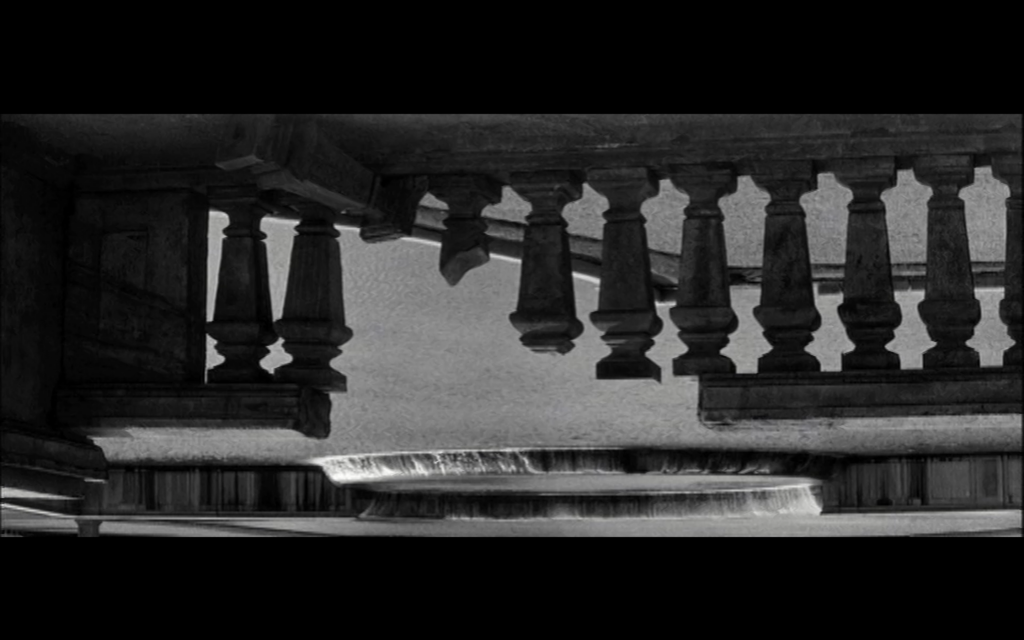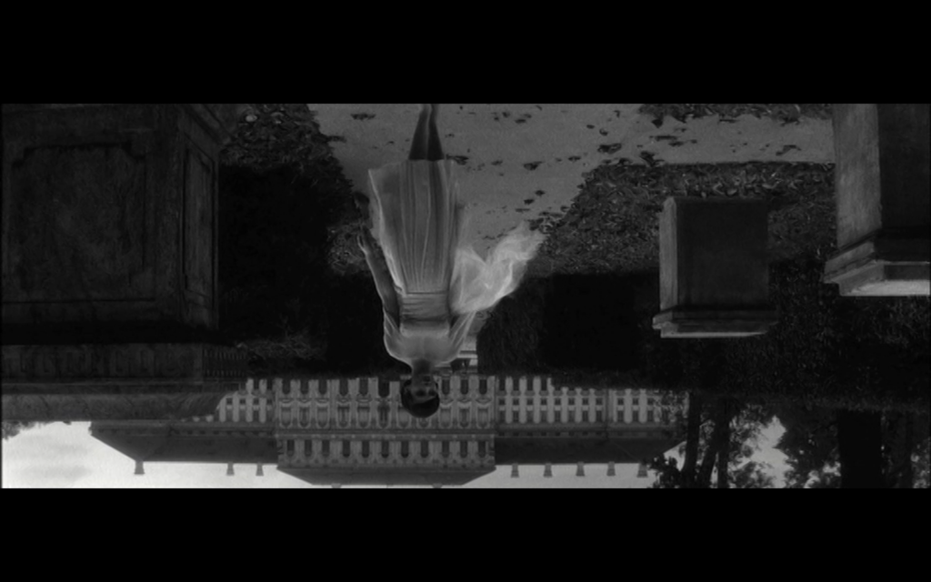 Les deux films possèdent donc, dès leurs titres-miroirs interchangeables, ce parcours déjà contrarié et impossible. Et de cette impossibilité, la première idée formelle du film de Laurent Fiévet apparaît clairement ; non pas retourner à Marienbad, mais retourner Marienbad et détourner l’année dernière. Ce retournement est le point de départ du montage : simplement faire basculer du haut vers le bas un total de seize plans du film original.
